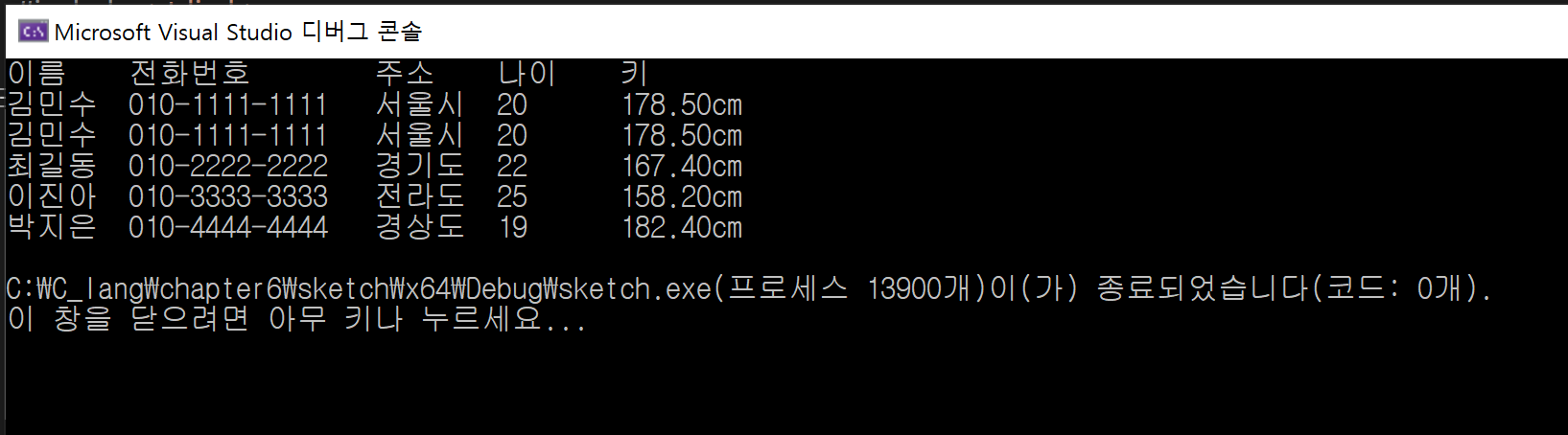 printf("이름\t전화번호\t주소\t나이\t키\n");