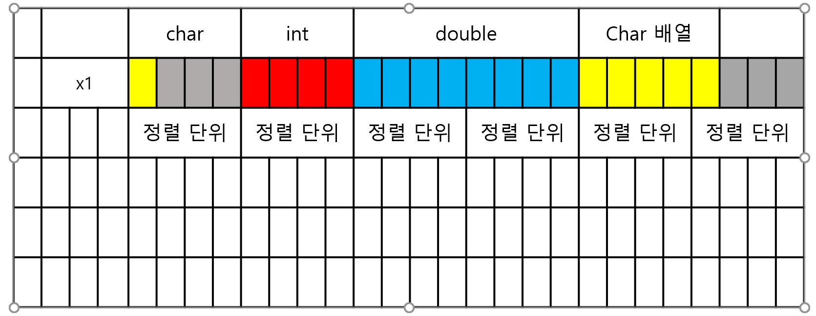구조체 변수x1 한개가 선언되면 구조체 자료형안에 멤버 변수의 자료형들의 크기에 맞게 메모리 크기를 할당하게 됩니다. 이 때 구조체 안의 기본 자료형을 살펴보면 char형 1byte , int형 4byte, double형 8byte, char형 배열[5] 5byte 들을 모두 합해 18byte의 자료형 크기를 가질 것 같지만 실제는 24byte를 갖습니다. 왜냐하면 컴파일러에서 Struct member alignment 옵션이 있어서 구조체의 멤버 변수를 단위에 맞게 정렬하기 때문입니다. 1,2,4,8,16 byte 중 하나를 선택할 수 있는데 보통 4byte로 설정되어 있습니다. 컴퓨터가 데이터를 보통 4byte의 단위로 처리하기 때문입니다. 위의 그림에서 자료형들을 순서대로 정렬하면 회색칸 만큼의 빈 공간이 정렬 옵션에 의해 생기게 될 것입니다. 그래서 구조체 멤버 변수를 선언하는 순서에도 신경을 써야합니다. 만약 구조체 변수를 포인터 변수로 설정하면 이와 같은 구조체 자료형의 크기를 아는 것이 포인터 연산을 할 때 중요할 것입니다.