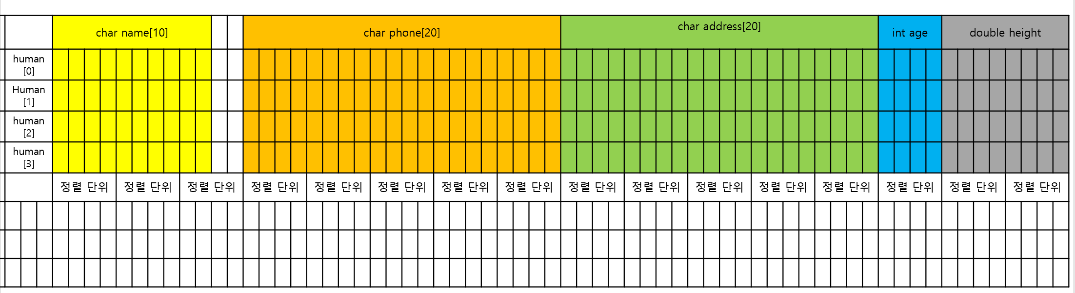 이렇게 만들어진 구조체를 사용하여 크기가 4인 배열 human을 선언하고 초기화 했습니다. 초기화를 할 때에는 중괄호를 중첩하여 사용합니다. human 인덱스 순서대로 중괄호를 두번 중첩하여 순서대로 값을 입력합니다. 멤버 변수의 순서도 유의하면서 입력합니다. 또한 멤버 변수로 배열들이 있는데 문자열 입력 시 이중 따옴표안에 문자열을 넣어서 초기화 해주는 것도 기억해야 합니다. 아래 그림은 위의 구조체 배열이 차지하는 공간을 표현한 그림입니다. 14~19번줄