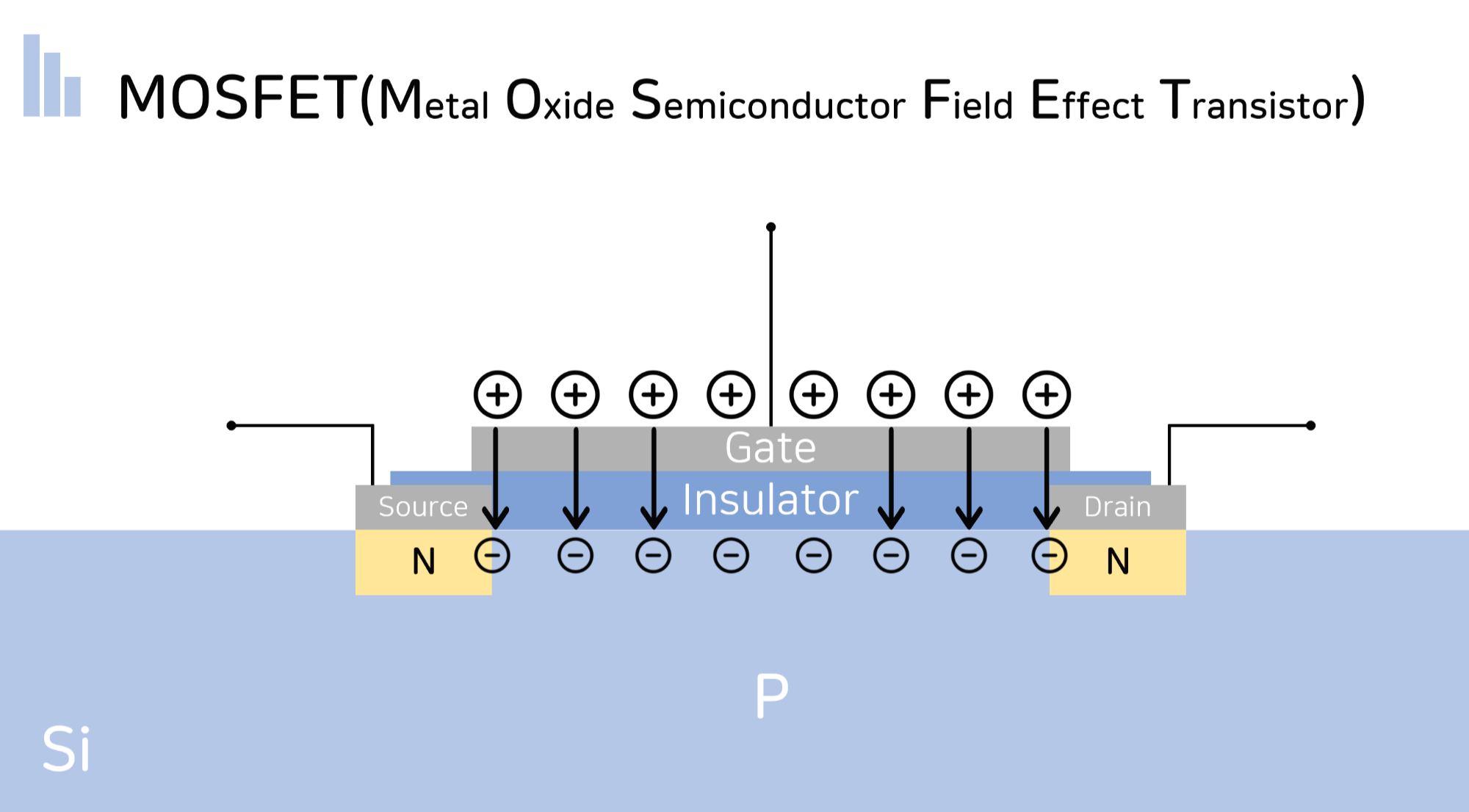 그럼 이제 Source 와 Drain 사이에 전류를 흐르게 하려면 어떻게 해야 할까요? 바로 Gate에 양전하를 많이 축적시키는 것입니다. Gate에 배선을 연결한 뒤 반대쪽에 양극을 연결한다면 Gate물질 내의 전자가 이동하면서 Gate에는 양전하가 상대적으로 많아 양극을 띄게 됩니다.