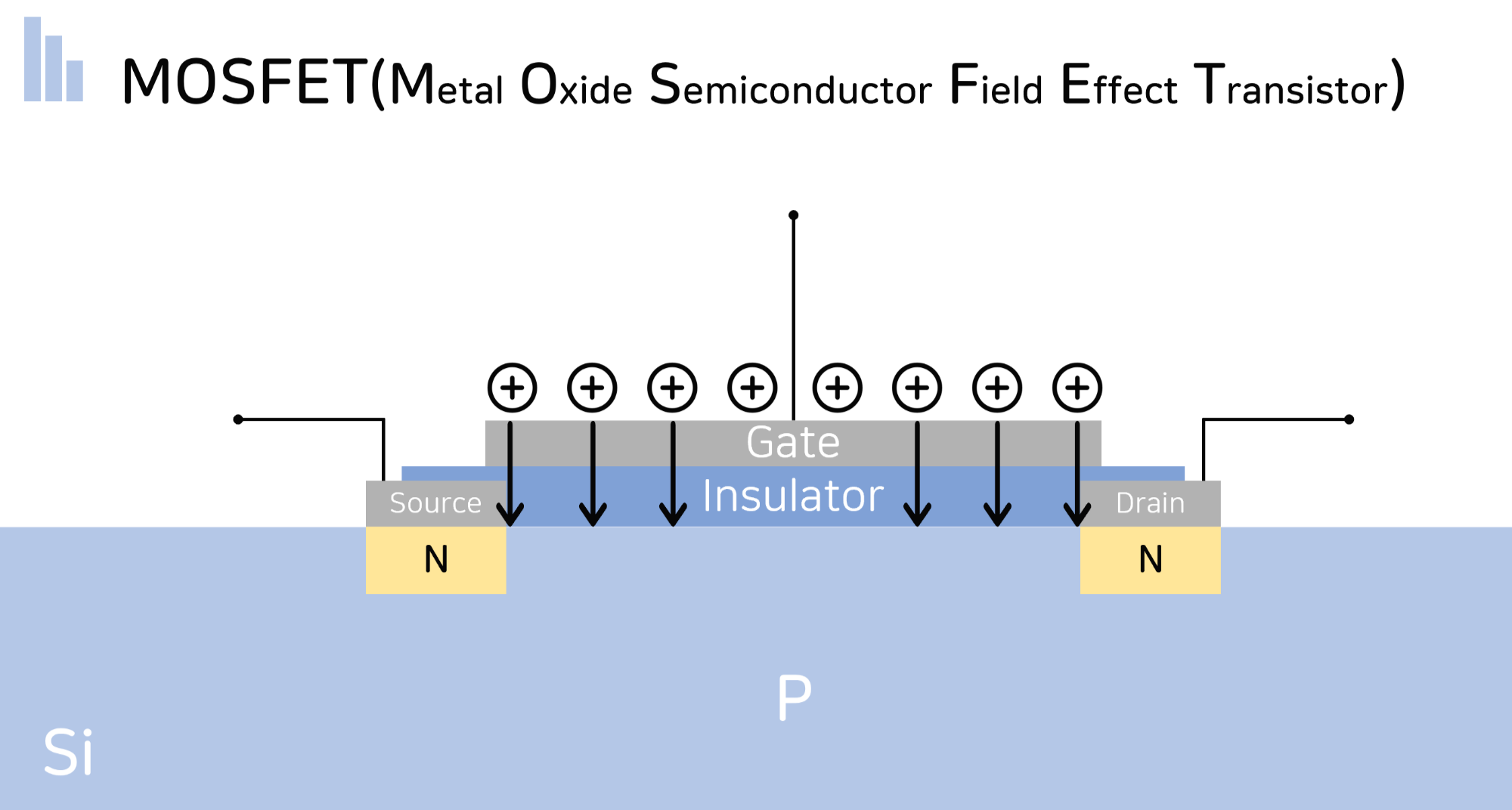 MOSFET 소자라는 이름은 그 구조의 형태에서 나온 이름입니다. Metal 은 금속으로 도체, Oxide는 산화물로 부도체, Semiconductor는 반도체이고 평상시에는 전압을 가하더라도 바로 전류가 흐르지 않는 상태입니다. Field Effect 는 '전계효과' 로 쉽게 양극 또는 음극을 띄는 물질 주변에는 전기장이 발생한다고 생각하시면 됩니다 .