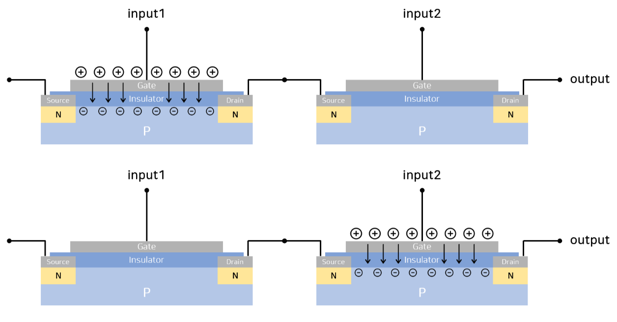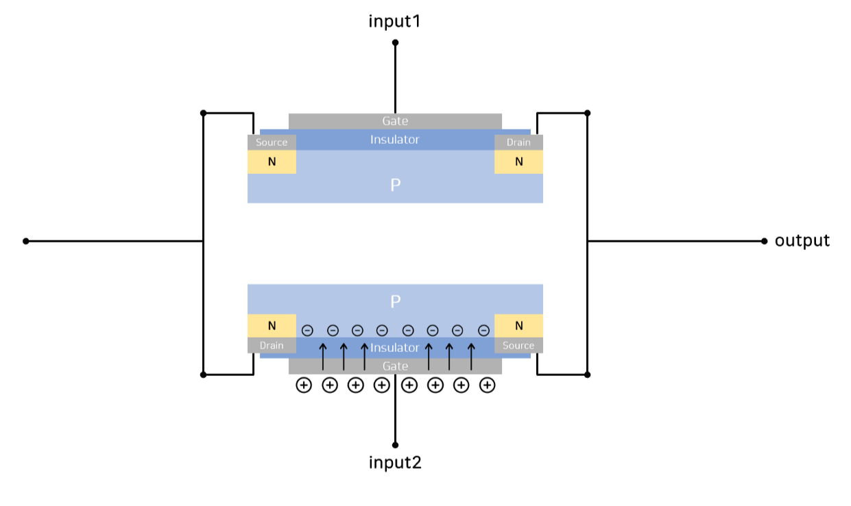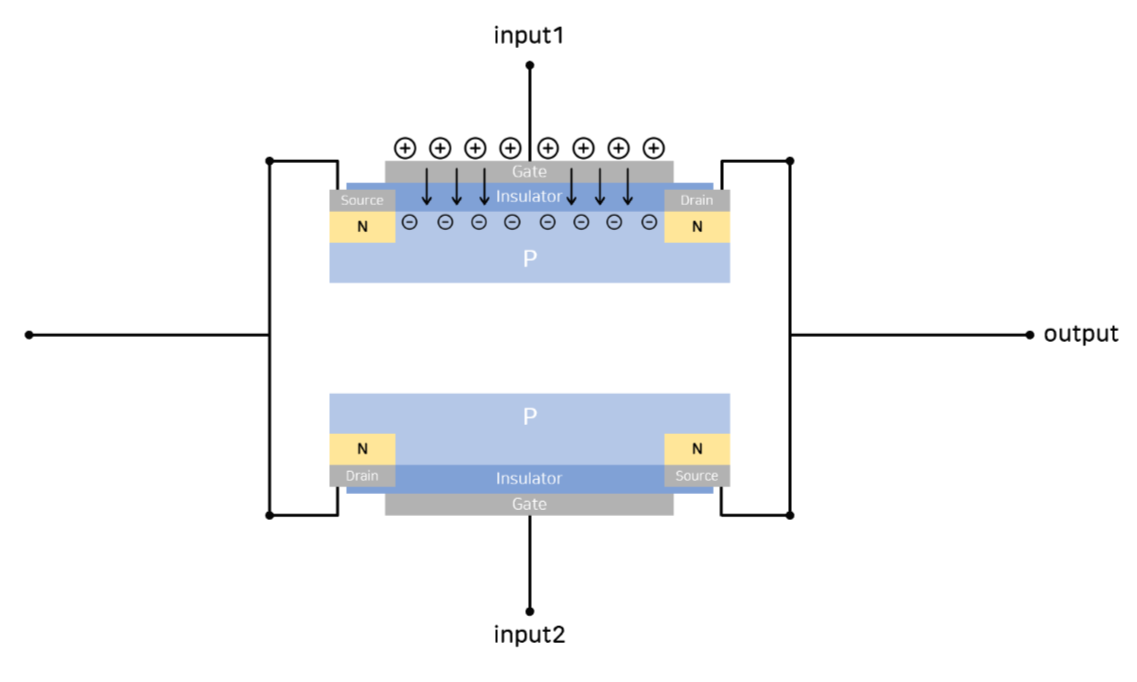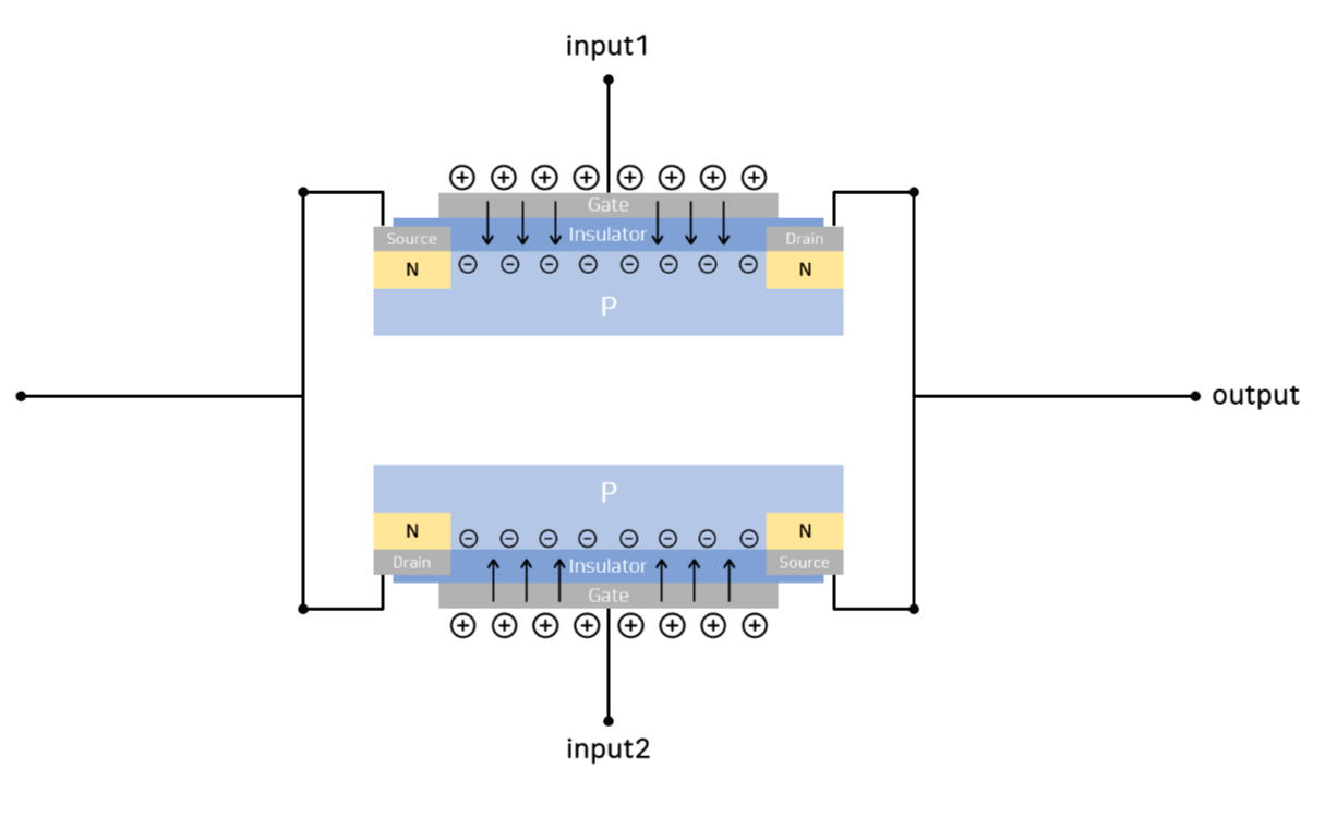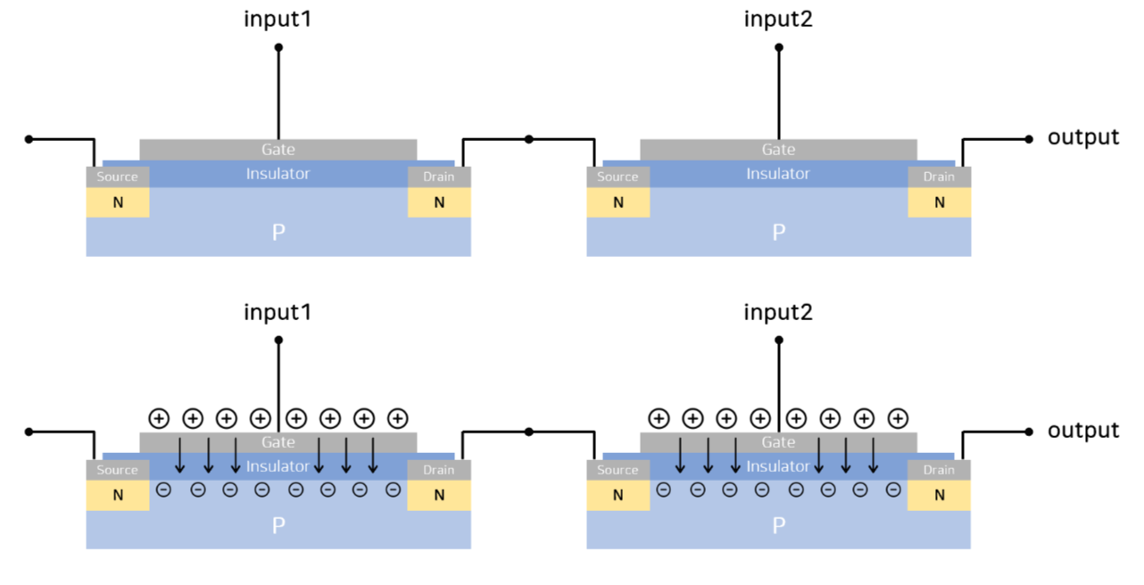 위의 그림에서 input 1,2 모두에 입력된 신호가 0이라면 (Gate 에 전압이 가해지지 않는 상황) 전류가 흐르는 길이 모두 막혀 있어 output 에 나오는 전류는 없으므로 그 값은 '0'이 출력됩니다. 반대로 입력 신호가 모두 '1'이라면 모두 길이 형성되어서 output 에 전류가 흐르므로 출력값은 '1'이 됩니다.